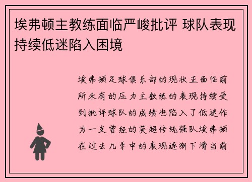 埃弗顿足球俱乐部的现状正面临前所未有的压...