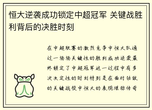 在中超联赛的激烈竞争中,恒大队通过一场场...